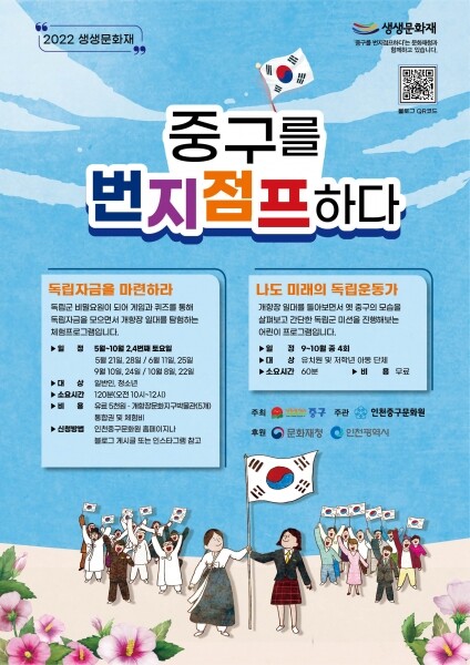 인천 중구의 생생문화재 사업 ‘중구를 번지점프하다’는 지난 2019년 처음 선정된 이후 개항장 일대의 근대문화재를 역사교육의 장으로 활용한 특색있는 문화재 체험 프로그램으로 중구를 방문하는 관광객과 구민들의 꾸준한 호응을 받고 있다.