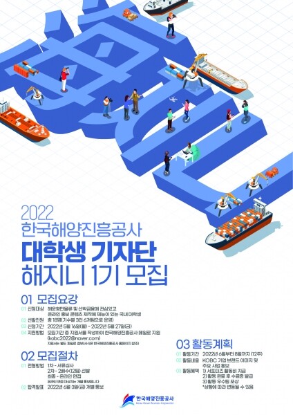모집 대상은 해운항만물류 및 선박금융에 관심 있고 온라인 홍보 콘텐츠 제작에 재능이 있는 국내 대학생으로 선발된 기자단은 오는 6월부터 8월까지 12주 동안 공사의 기업 브랜드 이미지 및 주요 사업 홍보를 위해 활동하게 된다.