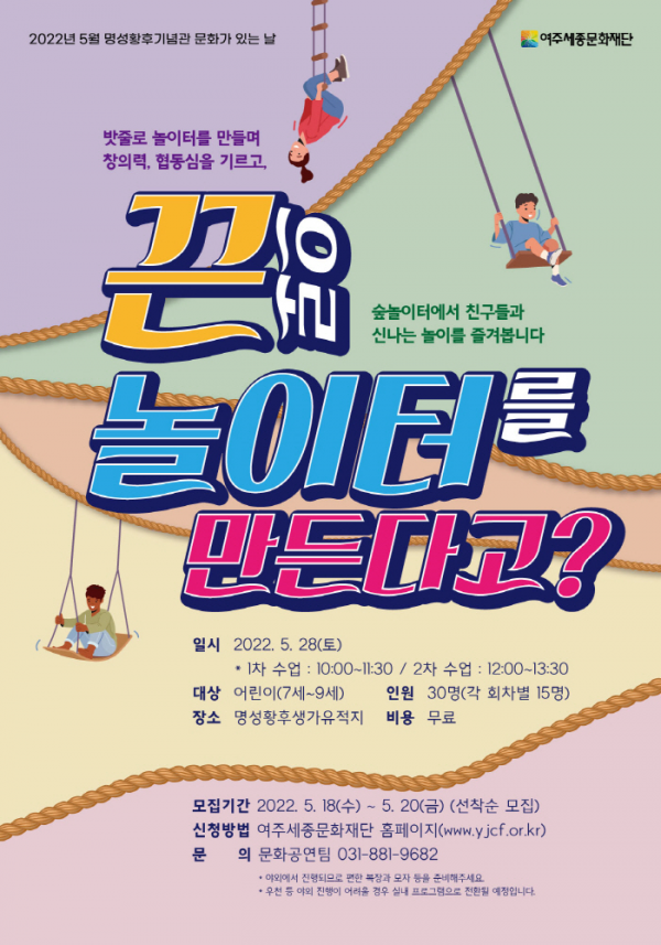 매달 다양한 프로그램을 선보이는 명성황후기념관 5월 문화가 있는 날은 어린이들이 전문 강사와 함께 야외에서 밧줄과 매듭을 활용해 놀이터를 직접 만들어보는 워크숍이다.