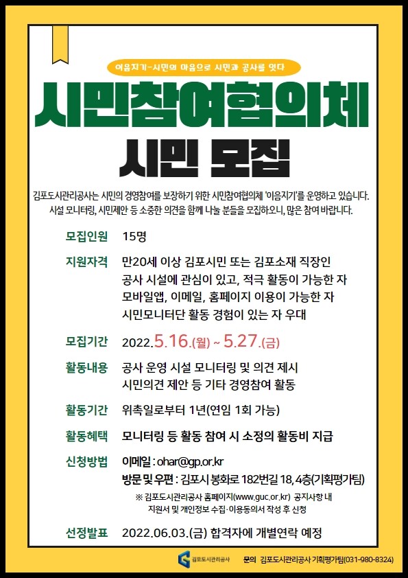 지원대상은 공사에 관심있는 만 20세 이상 김포시민이면 누구나 지원할 수 있으며 지원을 희망하는 시민은 김포도시관리공사 홈페이지 공지사항에서 제출서류를 작성해 이메일 제출 또는 방문, 우편접수 하면 된다.