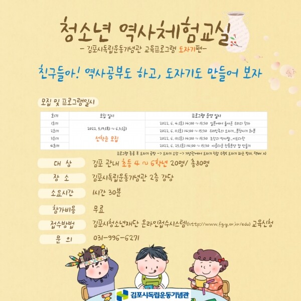 김포시독립운동기념관 관계자는 “체험하는 역사교육 프로그램 운영을 통해 청소년들에게 역사에 대한 흥미를 유발하는 할 수 있을 것으로 기대한다” 며 “앞으로도 재미있는 역사교육 프로그램 개발을 위해 노력하겠다”고 전했다.
