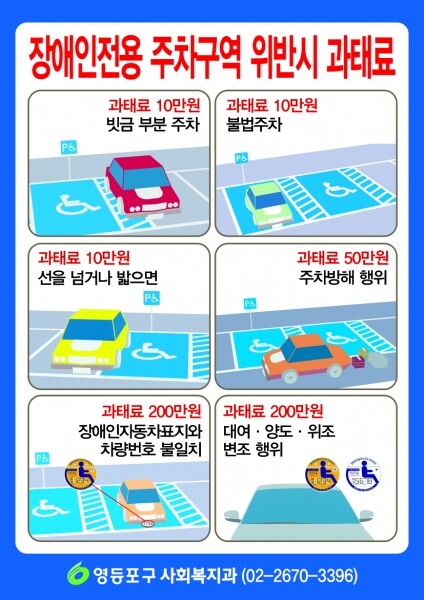 한편 장애인전용 주차구역에 불법 주차하거나 주차방해 행위를 발견한 경우, 행정안전부의 ‘생활불편 신고 앱’을 활용하거나 영등포구 주차문화과 또는 사회복지과로 신고하면 된다.