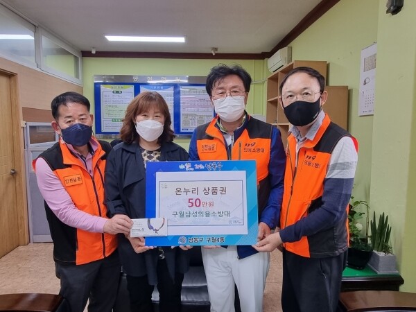 김은실 구월4동장은 “매번 어려운 이웃을 위해 꾸준히 이웃돕기를 실천하는 구월남성의용소방대에 감사드리며 기탁받은 물품은 코로나19로 인해 생계를 유지하기 힘들어진 복지 사각지대와 저소득층에게 전달할 계획이라고 전했다”고 밝혔다.
