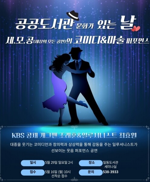 가정의 달을 맞아 열리는 이번 세모공은 KBS 코미디언 조래훈과 일루셔니스트 최효원이 꿈과 희망의 메시지를 담은 마술 공연으로 전 연령이 즐길 수 있는 유쾌한 웃음을 선사할 예정이다.