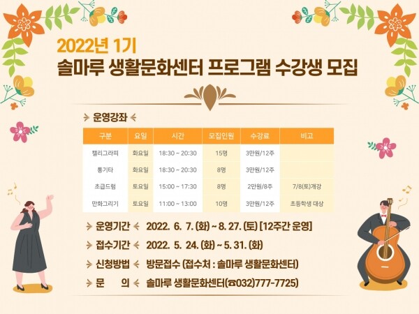 각 강좌별 모집인원은 8명~15명 내외로 참여를 원하는 주민들은 5월 31일까지 솔마루 생활문화센터를 방문해 접수하면 된다.
