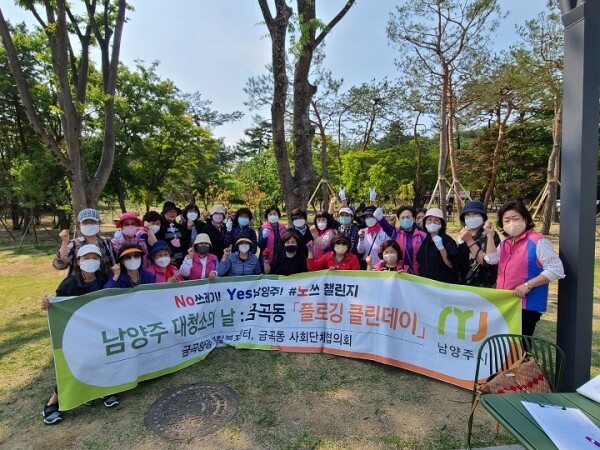이날 행사에는 금곡동 생활개선회, 걷기연맹 금곡동지회 단체 회원 및 공무원 50여명이 참여했으며 금곡동 관내 주요 무단투기지역 3개 권역을 중심으로 에코플로깅 활동을 통해 하천 및 도로변에 방치돼 있던 생활쓰레기 50kg를 수거했다.