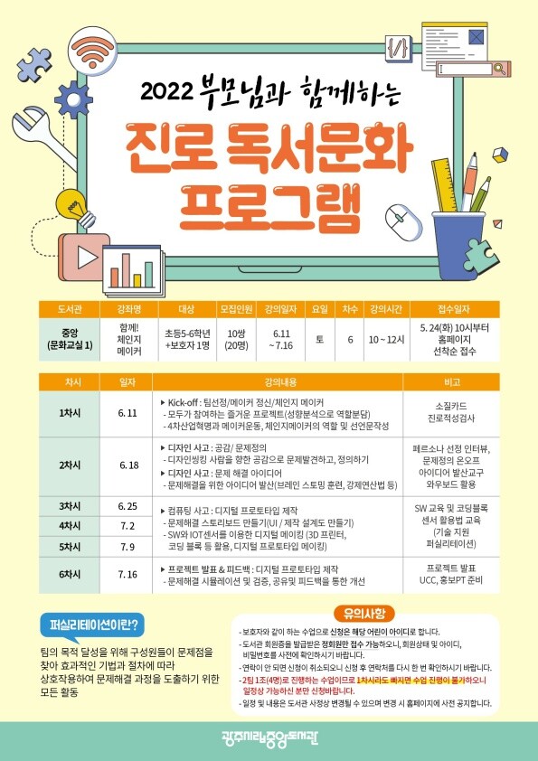 수강료와 재료비 부담 없이 초등학교 5~6학년 어린이들은 누구나 참여할 수 있으며 5월 24일부터 도서관 홈페이지에서 신청 가능하다.