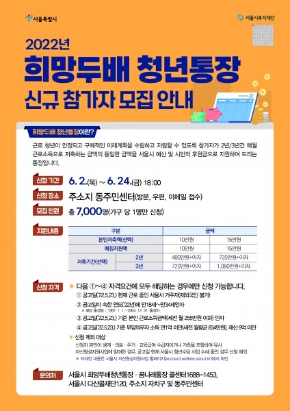 또한 생계·의료·주거·교육 수급자 부채가 5천만원 이상인 자 통장 개설이 불가능한 자 본인이 유사자산형성지원사업에 참여한 자 본인 및 가족이 자산형성지원사업 등에 참여한 자 공고일 현재 서울시 청년수당 사업 수혜 중인 자인 경우 신청이 불가능하다 참여 희망자는 6월 2일부터 24일까지 주소지 관할 동주민센터에 방문, 우편 또는 이메일로 신청하면 된다.