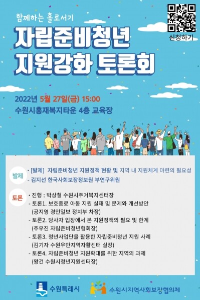 수원시지역사회보장협의체가 주관하는 이날 토론회에서는 자립준비청년 자립지원정책의 현황과 한계점을 짚어보고 자립준비청년에 대한 지역사회 지원 강화 방안을 모색할 예정이다.