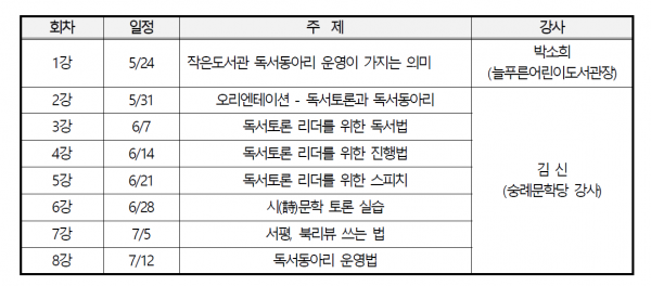 이번 교육은 5월 24일 늘 푸른 어린이도서관 관장인 박소희 강사의 ‘작은도서관 독서동아리가 가지는 의미’에 대한 기조 강연을 시작으로 김신 강사의 독서토론리더 교육이 5월 31일부터 7월12일까지 매주 화요일 진행될 예정이다.