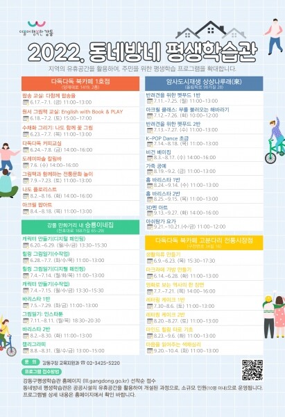 신청은 강동구평생학습관 홈페이지에서 선착순 모집하며 프로그램은 공간규모를 고려해 10인 이내로 6월부터 10월까지 각 동네방네 평생학습관에서 운영된다.
