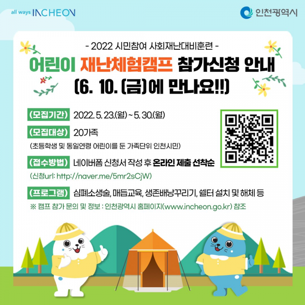 긴급구조지원기관 중 하나인 대한적십자사 인천지사와 공동 주관하는 이번 캠프는 어린이가 있는 가족을 대상으로 일상화된 재난 속에서 스스로 안전을 지킬 수 있도록 하기 위해 마련됐다.