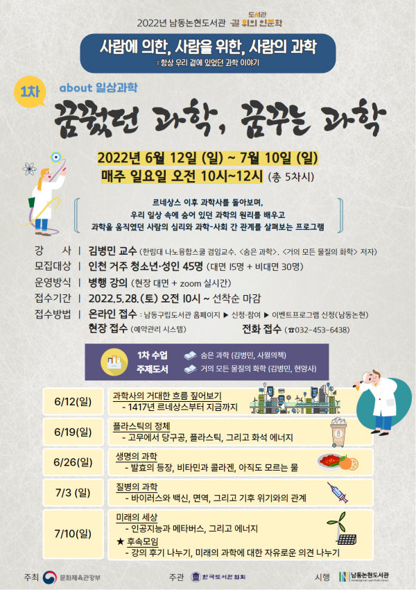 과학에 흥미가 있는 청소년 이상 인천 시민이라면 누구나 참여 가능하며 5월 28일 남동구립도서관 홈페이지나 현장 방문, 유선을 통해 접수할 수 있다.
