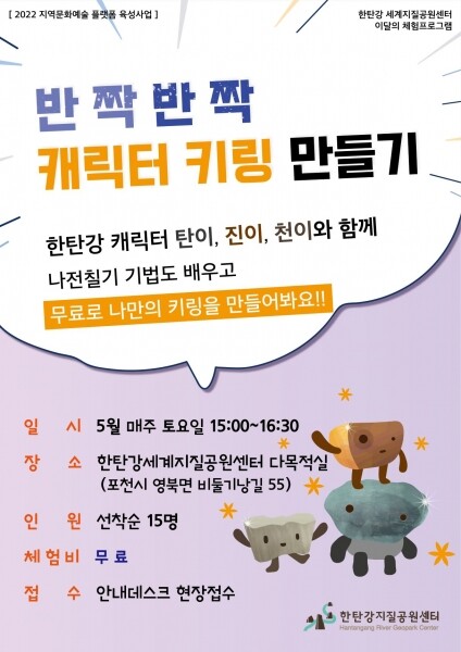 첫 프로그램인 5월은 ‘반짝반짝 캐릭터 키링 만들기’로 한탄강 지질공원 캐릭터에 색칠을 하고 전통의 나전칠기 기법을 이용해 나만의 아름다운 키링을 만들어 보는 체험 프로그램이다.