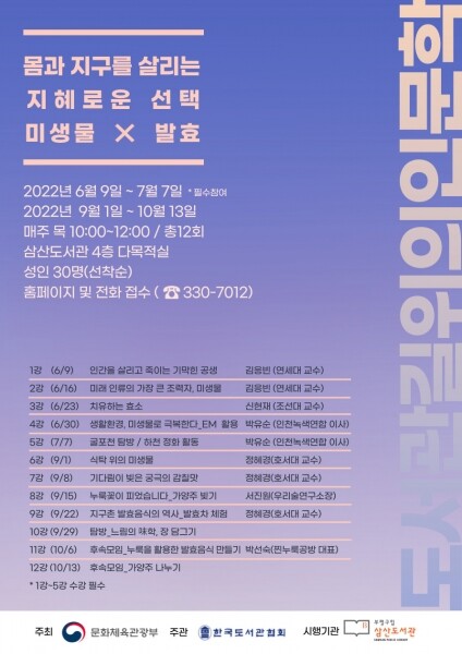 배창섭 부평구립도서관 본부장은 “이번 길 위의 인문학 프로그램은 건강한 미래사회를 위해 미생물과 발효를 우리 일상생활에서 이롭게 활용하는 방법을 배우는 시간이 될 것”이라고 했다.