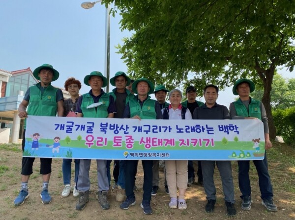 이날 백학면새마을남녀지도자와 백학초, 노곡초 학생 등 60여명은 생태계 복원을 위해 북방산개구리를 방류하며 환경보존의 의미를 되새겼다.