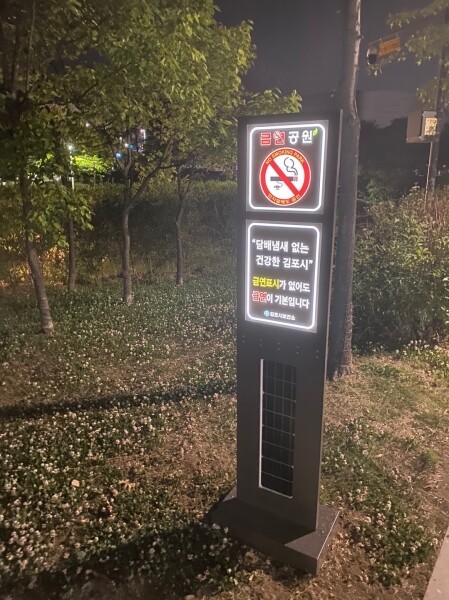 김포시는 5월, 금연환경조성과 간접흡연 피해 예방을 위해 관내 도시공원 중 흡연 민원 다발 공원이거나 규모가 큰 도시공원을 선정해 금연구역 태양광 LED 안내표지판을 설치했다.