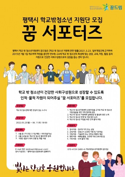 평택시 학교밖청소년지원센터 ‘꿈 서포터즈‘ 모집