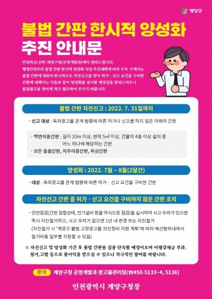 자진신고는 계양구청 공영개발과 광고물관리팀으로 문의 후 방문신고 또는 유선으로 신청하면 된다.