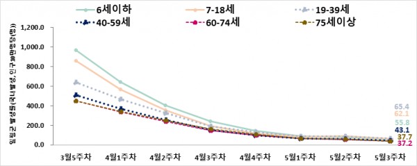 모든 연령대에서 평균 발생률이 전주 대비 감소했으며 19세이하 연령군에서 여전히 높은 발생률을 유지 중이다.