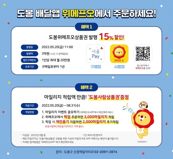 3억원 규모로 발행된 이번 ‘도봉위메프오상품권’은 1인당 월 20만원까지 서울페이+ 앱에서 구매 가능하며 사용기한은 구매일로부터 1년이다.