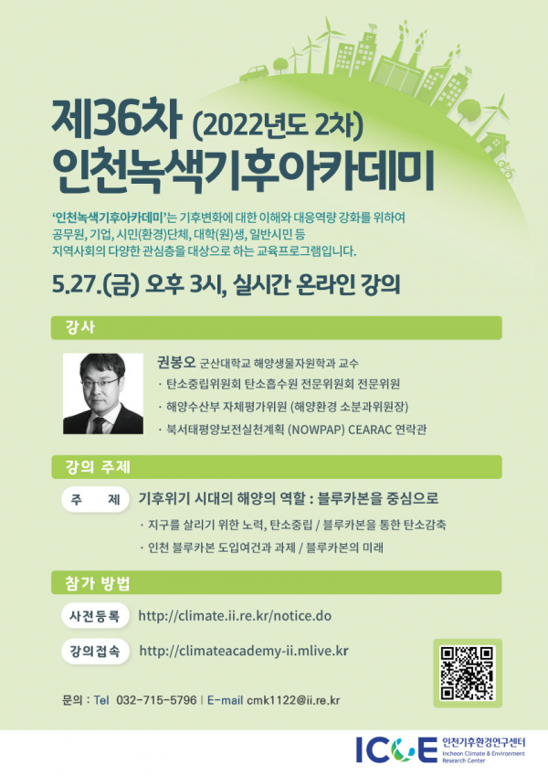 이번 아카데미에서 권교수는 블루카본을 통한 탄소감축, 블루카본의 미래, 그리고 인천에의 시사점에 대해 강의할 예정인데, 여기서 ‘블루카본’이란 어패류, 잘피, 염생식물 등 연안 및 해양생물과 맹그로브숲, 염습지, 잘피림 등 해양 생태계가 흡수하는 탄소를 의미한다.