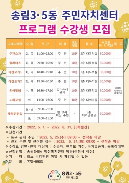 송림3·5동 주민자치센터에서 운영될 요가, 노래교실 등 총 7개의 프로그램은 6월부터 8월까지 3개월간 운영될 예정이며 관내 주민의 경우 5월 25일부터 5월 30일까지, 관외 주민의 경우 31일 하루만 잔여분에 한해 수강 신청할 수 있다.