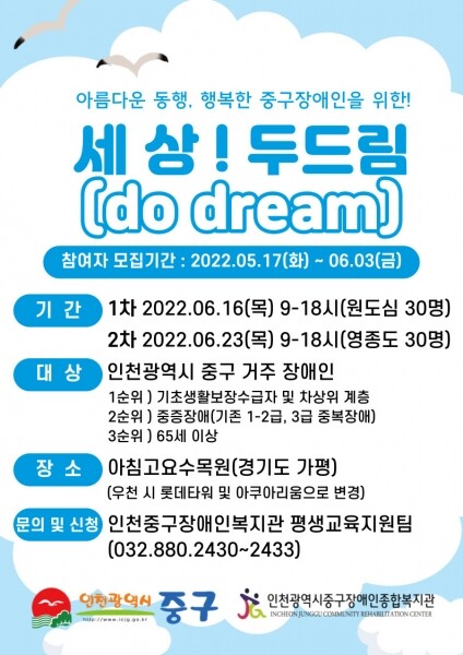 ‘세상 두드림여행’사업은 중구가 주최·지원하고 인천중구장애인종합복지관이 주관한다.