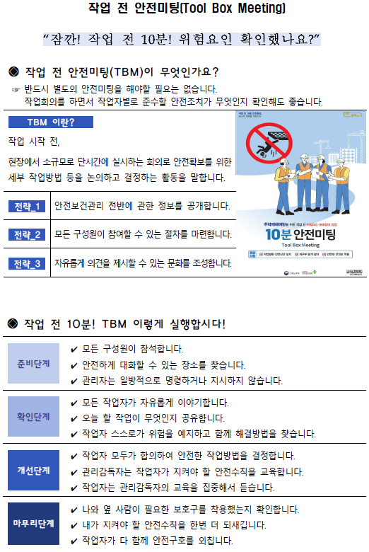 아울러 고용노동부는 건설·제조업을 불문하고 “‘위험요인을 잊어버리는 사람의 약점’을 보완하는 방법으로 작업 현장에서 ‘작업 전 안전점검’을 실시해 줄 것”을 당부했다.