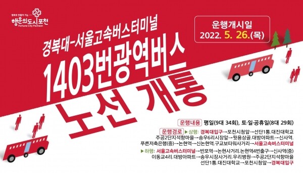 시 관계자는 “1403번의 개설로 포천에서 서울을 운행하는 광역버스는 7개 노선 90대로 늘어나게 됐다 포천에서 서울로 출퇴근하거나 서울고속터미널을 이용하는 시민들에게 큰 편의를 제공할 것으로 기대한다”며 “포천시는 서울권으로의 접근성을 강화하기 위해 앞으로도 광역버스 노선 확충에 최선을 다 하겠다”고 전했다.