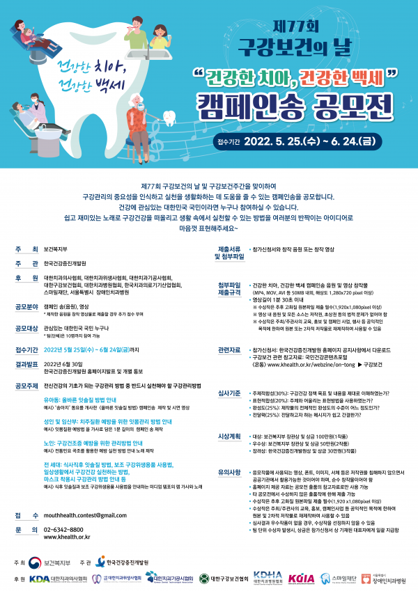 전 국민에게 구강관리의 중요성을 알리고 실천의지를 확산하고자 마련한 이번 공모전의 접수 기간은 구강보건의 날인 6월 9일 전후인 5월 25일부터 6월 24일까지로 구강 건강에 관심 있는 국민 누구나 참여할 수 있다.
