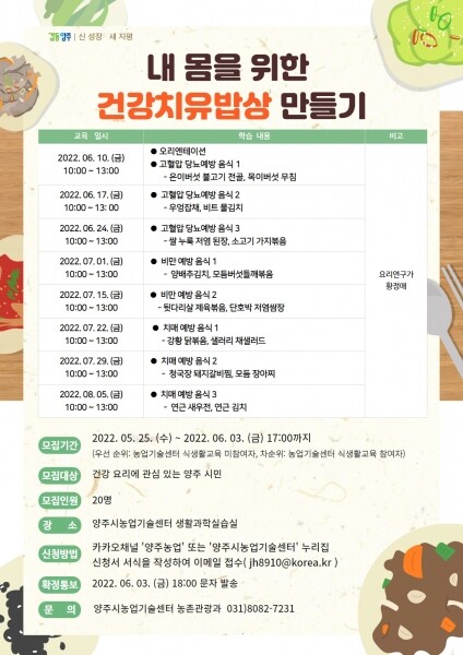 수강대상은 식생활 교육에 참여하지 않은 양주시민이라면 누구나 참여할 수 있고 총 20명을 선착순 모집한다.