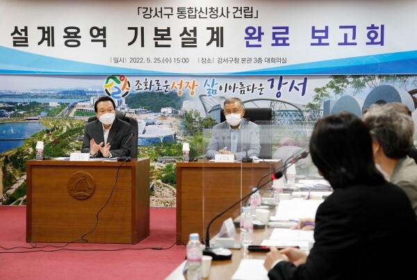 구는 25일 구청 대회의실에서 노현송 구청장을 비롯해 사업 관계자 등 10여명이 참석한 가운데 ‘강서구 통합신청사 건립 설계용역 기본설계 완료보고회’를 열었다.