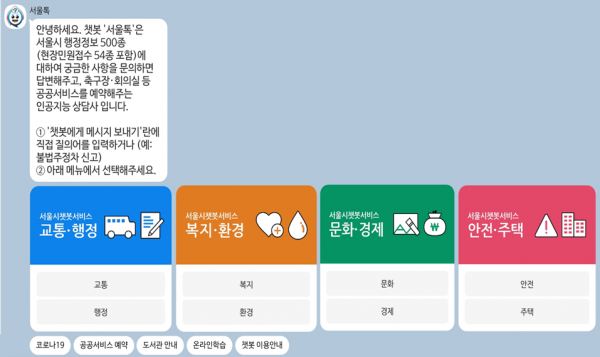 박종수 서울시 스마트도시정책관은 “서울톡은 별도의 앱을 설치하거나 웹 사이트를 일일이 방문할 필요 없이 시민들이 많이 이용하는 카카오톡에서 서울시정과 관련한 상담과 민원을 해결할 수 있다”며 “앞으로도 대시민 서비스 영역을 확장하고 다양한 인공지능 기술과 결합해 개인 맞춤형 서비스를 고도화해나가겠다”고 말했다.