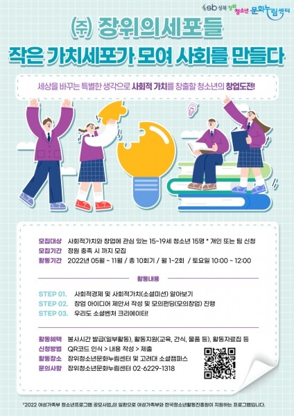 ‘장위의 세포들’은 2022년 여성가족부 청소년 프로그램 공모를 통해 선정된 사업으로 사회적 가치와 모의 창업에 관심 있는 15~19세 청소년을 대상으로 오는 11월까지 총 10회에 걸쳐 진행되는 프로그램이다.