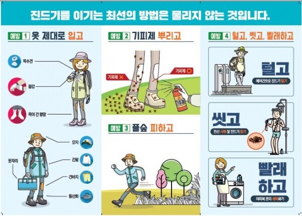 특히 농작업 및 야산·들판에서 야외활동 시 피부 노출을 최소화하고 노출된 피부에 진드기 기피제를 뿌리는 것이 좋다.