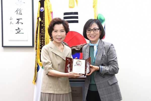 유경숙 경기도여성단체협의회 의정부시지회장은“여성친화도시 의정부시의 발전을 위해 늘 열린 마음으로 귀 기울여주시고 함께해 주신 윤지인 명예회장님께 감사의 마음을 담아 이 패를 준비했다”고 말했다.