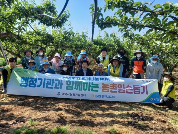 이날 일손돕기는 본격적인 영농철을 맞아 인력난을 겪고 있는 농가를 돕기 위해 농업기술센터, 로컬푸드재단 직원 및 농협중앙회 평택시지부 직원 등 20여명이 참여한 가운데 안중읍 소재 배 농장에서 진행됐다.