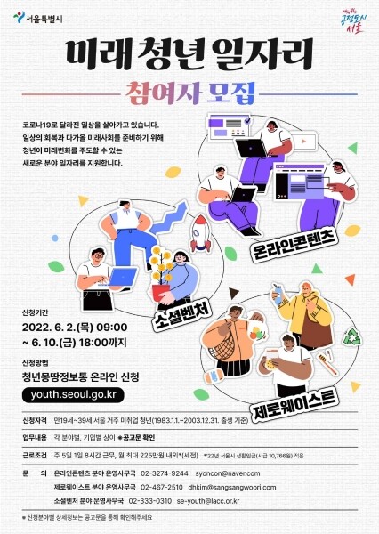 미래 청년 일자리는 콘텐츠 산업, 제로웨이스트 등 향후 일자리 수요가 커질 것으로 전망돼 청년들의 선호가 높지만 쉽게 접근하지 못했던 신성장 분야 기업과 청년 구직자를 매칭해 청년이 일 경험을 쌓을 수 있도록 지원하는 사업이다.