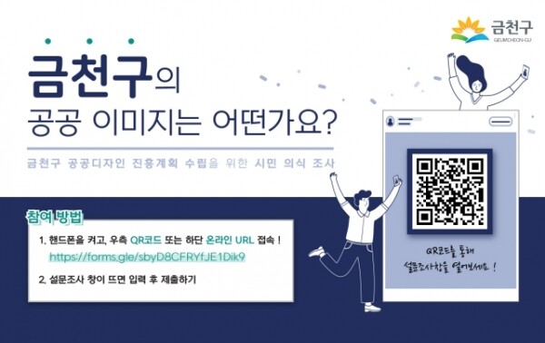 설문 내용은 금천구의 공공디자인 인식 정체성 디자인 정책 공공환경 평가 공공공간 개선에 대한 구민의견 등 16문항이며 금천구청 홈페이지 팝업존에 접속하거나 홍보물의 QR코드 인식을 통해 참여할 수 있다.