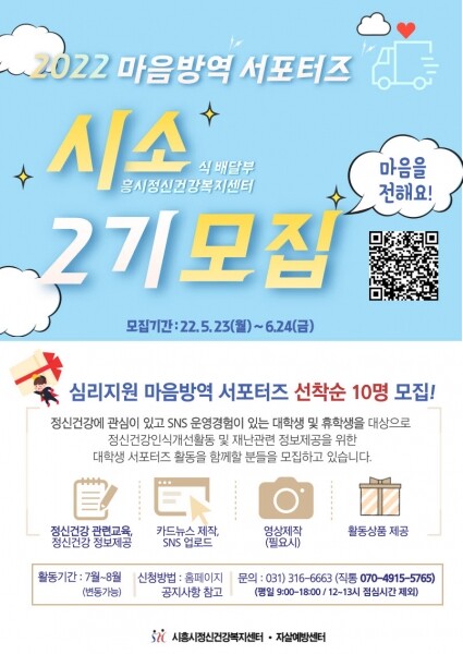 오는 6월 말부터 운영되는 ‘시소’는 정신 건강에 관심이 있고 SNS 운영 경험이 있는 대학생 및 청년을 대상으로 모집하며 시소 멤버가 되면 정신건강 인식개선 활동과 코로나19 재난 관련 정보 제공 등의 활동을 펼치게 된다.