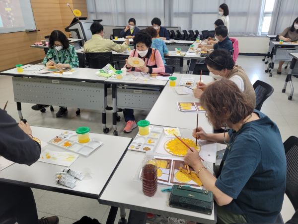 통장과정에서 추진한 ‘나만의 해바라기 만들기’ 실습에 참여한 교육생은 “모두 똑같은 해바라기를 보고 그렸는데 이렇게 하나하나 다른 그림으로 완성될 수 있다는 사실이 놀랍고 인상 깊다”고 소감을 밝혔다.