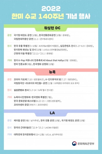 문체부 이진식 문화정책관은 “올해 수교 140주년 문화교류 행사를 통해 한미 관계가 더욱 풍성해지고 양국의 굳건한 우호 관계를 실질적으로 체감할 수 있을 것이다”며 “양국의 우의와 신뢰가 더욱 깊어지고 지속 가능한 문화교류 기반을 만들어 우리 예술가들과 문화산업의 해외 진출 기회가 더욱 확대되길 기대한다”고 밝혔다.