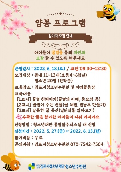 프로그램 참가자는 관내 초등 4~6학년 청소년 20명을 대상으로 모집하고 있으며 5월 27일 9시부터 6월 13일 오후 6시까지 김포시청소년재단 홈페이지 통합접수시스템을 통해 선착순으로 모집할 예정이다.
