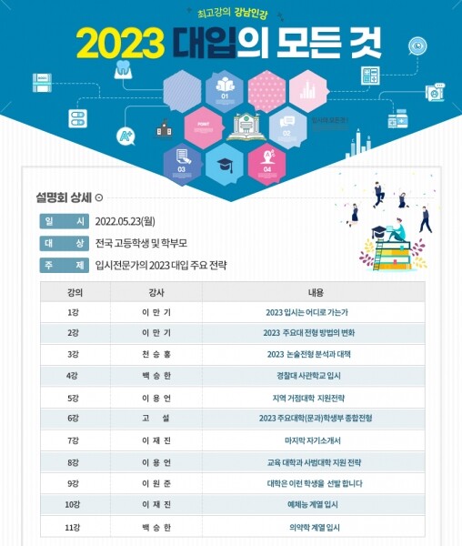 설명회는 사전 녹화된 강연을 23일 온라인에 공개하는 방식으로 이뤄졌으며 강의는 강남인강 홈페이지와 유튜브를 통해 회원가입 절차 없이 누구나 무료로 볼 수 있다.