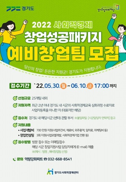 세부 지원 자격은 최근 2년 이내 경기도 시·군의 사회적경제교육 심화과정 수료자 또는 수료예정자로 사업등록자가 아니면 된다.