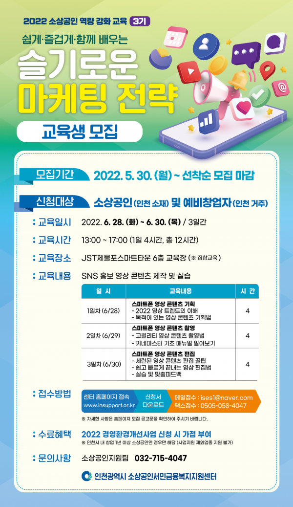 인천광역시는 6월28일부터 30일까지 사흘간 관내 소상공인 및 예비창업자들을 대상으로 ‘사회관계망 홍보 영상 콘텐츠 제작 및 실습’교육을 실시한다고 밝혔다.