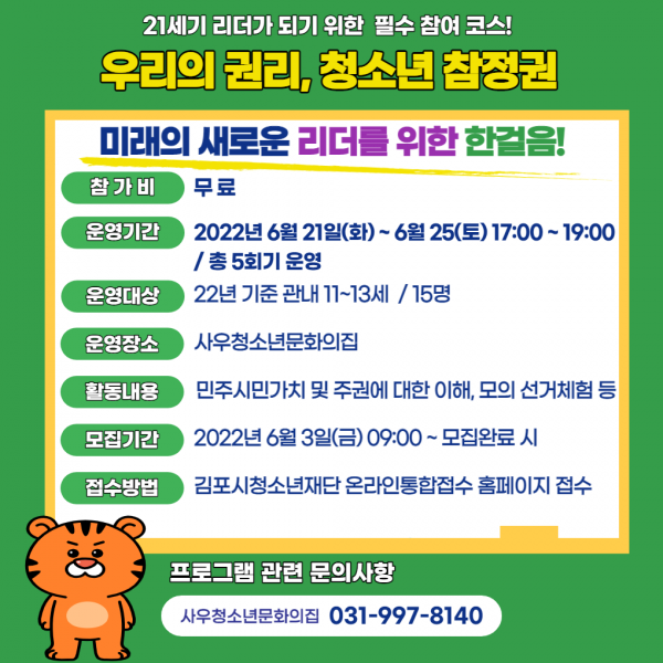 김포시청소년재단 조성훈 수련관장은 “미래 사회의 주체인 청소년들이 자신의 권리를 이해하고 행사할 수 있는 역량을 키울 수 있도록 적극 지원 하겠다”고 전했다.