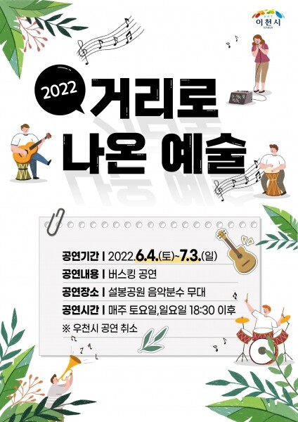 버스킹은‘이천시 거리로 나온 예술’사업으로 관내 25개 공연단체가 선정됐으며 산책과 음악분수 공연을 보기 위해 시민들이 자주 찾는 명소인 설봉공원 음악분수 무대에서 공연을 하게 된다.