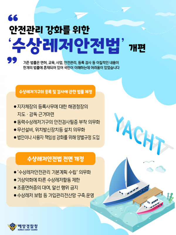 새롭게 제정된 ‘수상레저기구의 등록 및 검사에 관한 법률’에서는 지자체 소관 레저기구관리업무의 통일적이고 체계적인 집행을 위한 해양경찰청장의 지도·감독 근거 신설 레저기구의 무선설비, 위치발신장치 등 안전장비 설치·비치 등에 관한 근거를 신설했다.